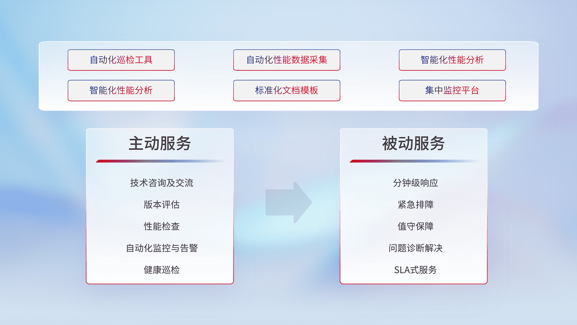 智能化工具和标准化文档,,保障服务质量,,提供主动服务(包含技术咨询、、版本评估、、性能检查、、自动化监控与告警、、健康巡检)和被动服务包含(分钟级响应、、、紧急排障、、、、值守保障、、、问题诊断解决、、SLA服务)。。。。